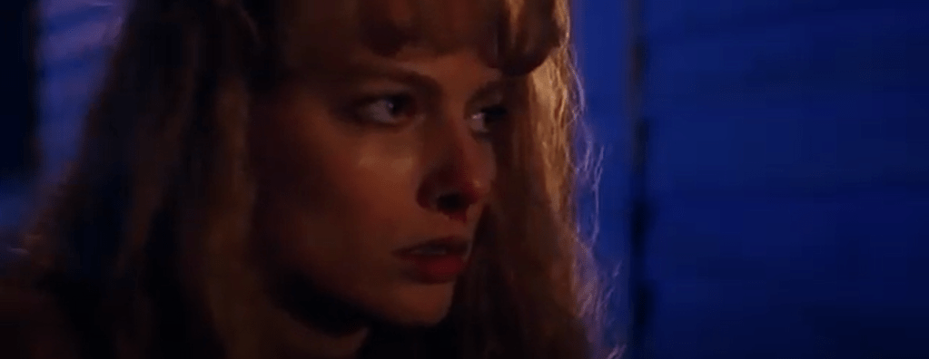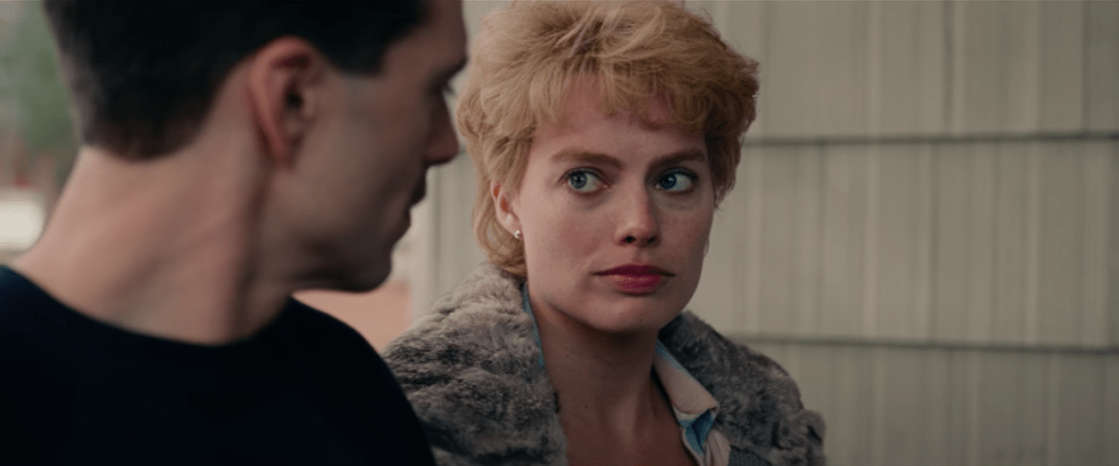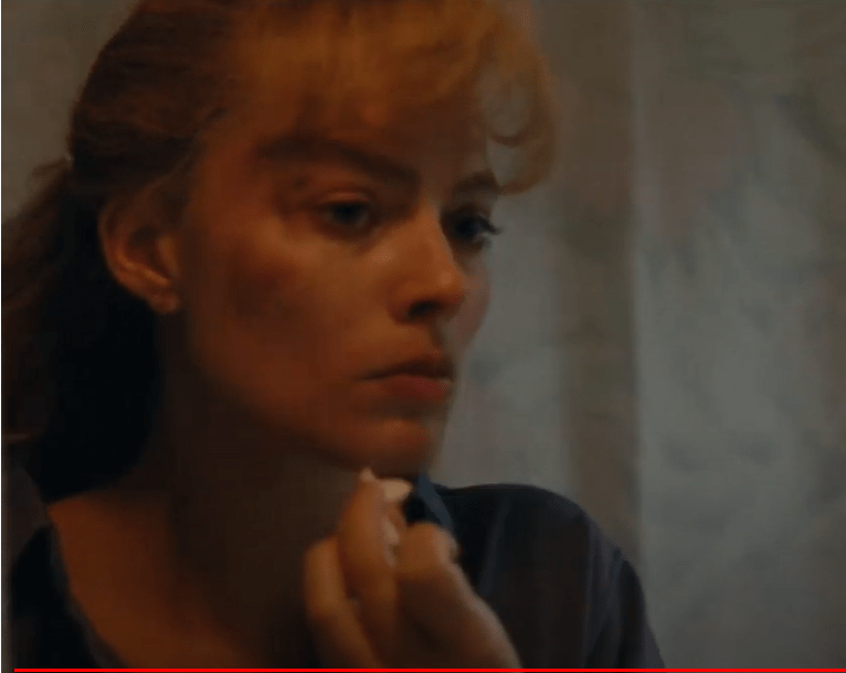 Margot Robbie is first seen as Tonya in age makeup, presumably depicting her in her mid 40’s. This casting choice allowed for the same actor at age 27 to portray both a fifteen year old girl and a woman in her 40’s through hair, makeup, and costume design. The makeup design not only depicts the process of time, but also tells a story of continuous physical abuse.