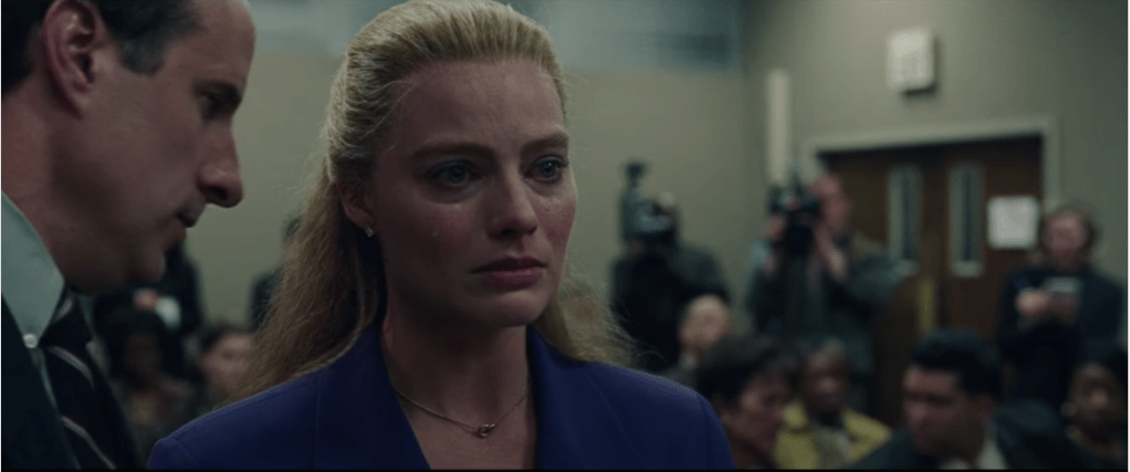 Tonya suffers multiple hits to the face during the film, and the makeup used shows that abuse in multiple stages. We see her cover up bruises with makeup that are in different progressions of healing, implying continuous domestic violence. In the scene where Jeff fires a gun at her and she falls to the ground, her exhaustion and panic is emphasized in the darkness under her eyes and the added gleam of sweat catches the light of the police cruiser.