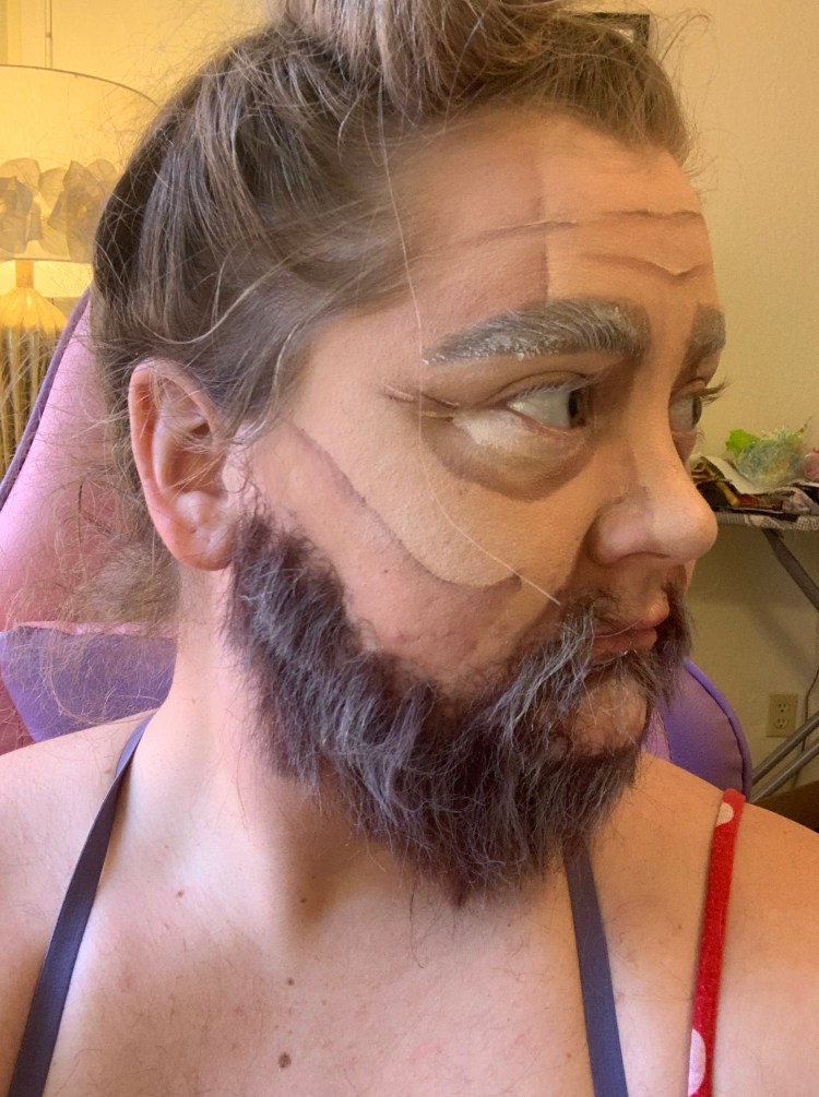 We had about an hour to film a short scene, and I had an exceptionally limited time in which to do my makeup. The result was a hasty, but successful old age/masc makeup with a painted on beard that made for a heartfelt and hilarious character.
